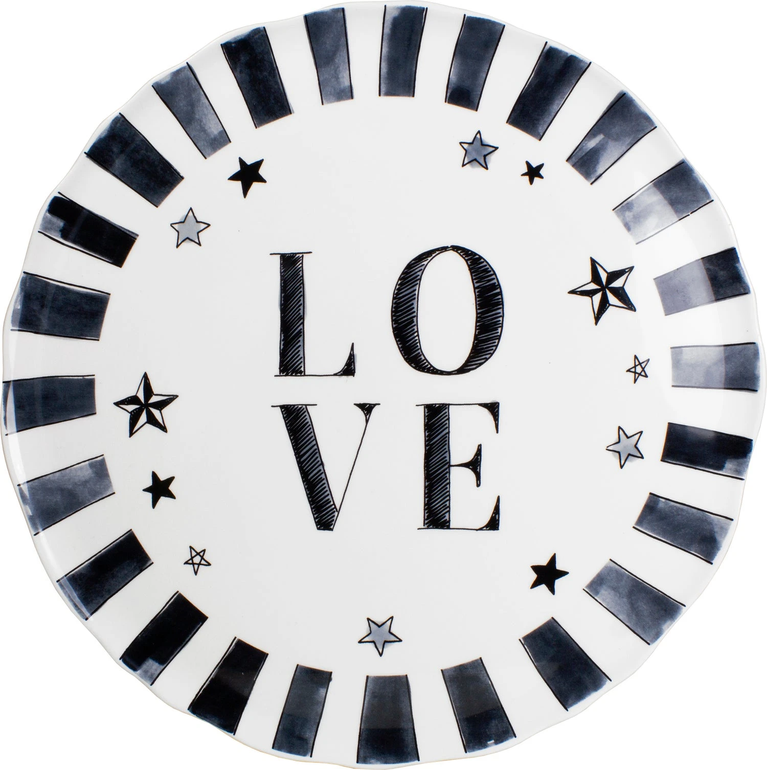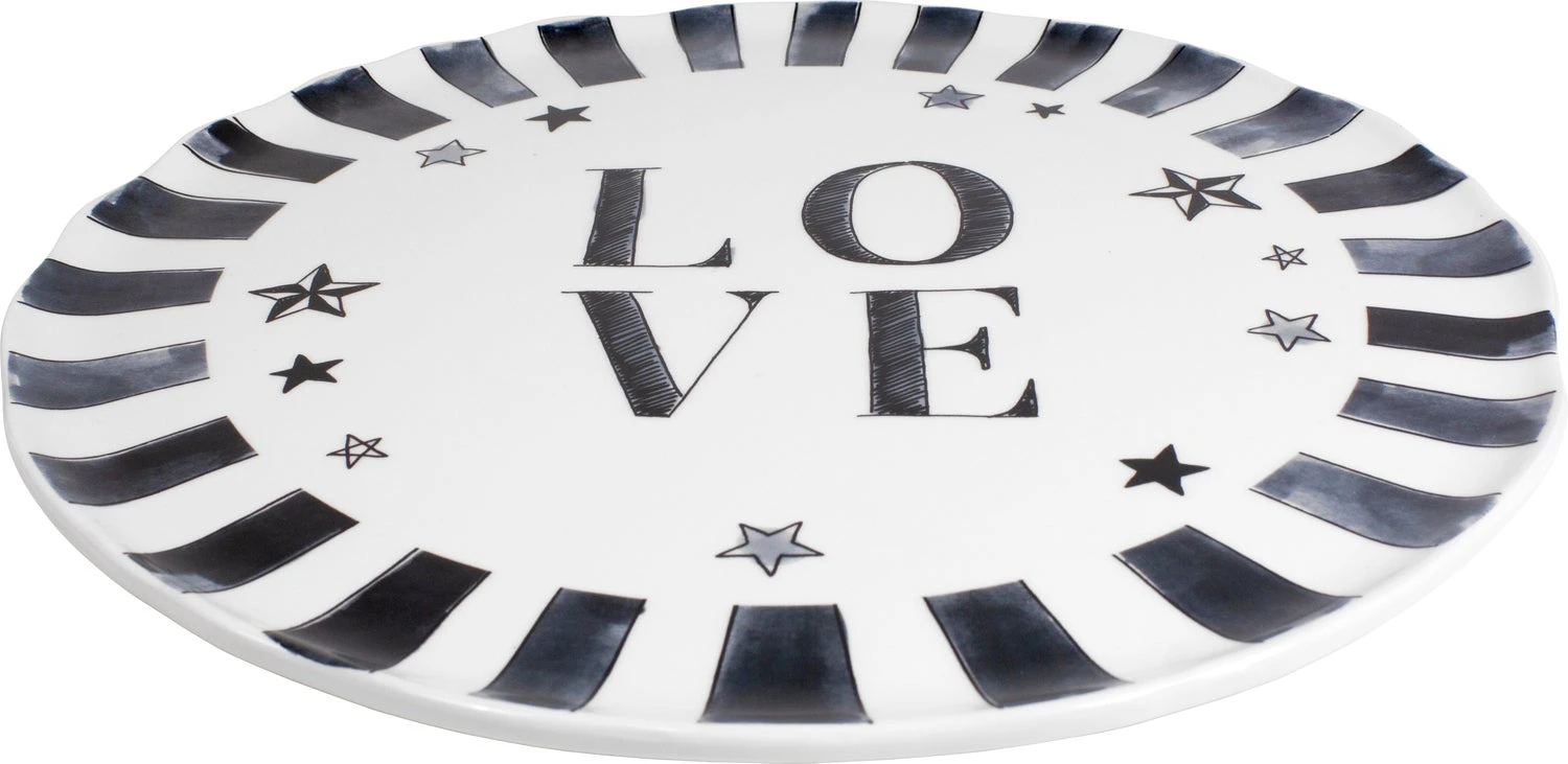 De zwart-witte tegenhanger Blond X Noir is groots uitgebreid. De herkenbare handcraft, met een ingetogener uitstraling vind je nu terug op nieuwe items. Waaronder dit extra grote platte bord van 31 cm. In het midden van het bord staat groot LOVE met daaromheen sterren en aan de rand dikke strepen rondom. Ideaal om als schaal over onderbord te gebruiken. Nu dus nog meer Blond Amsterdam voor wie minder van het bonte en blozende is.