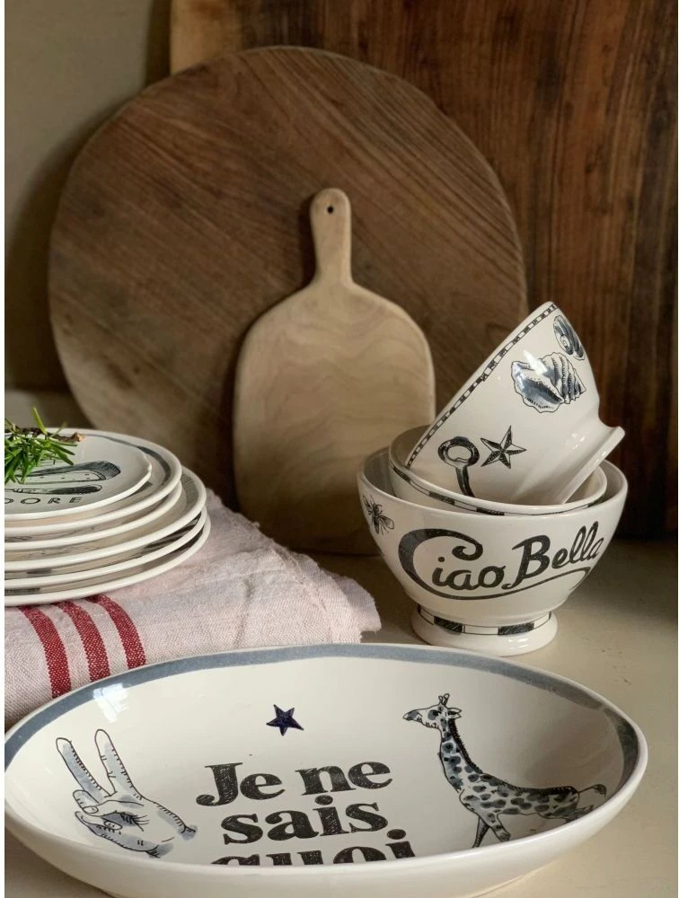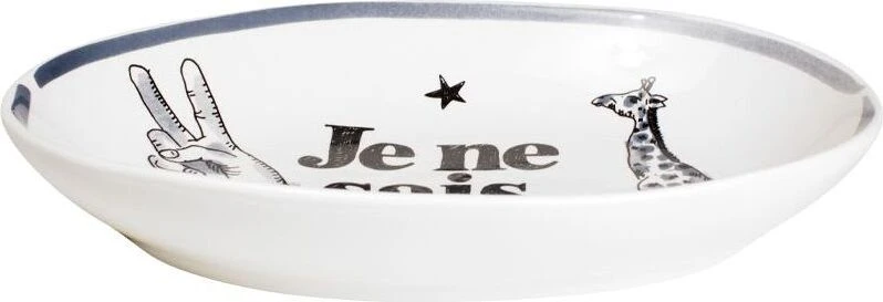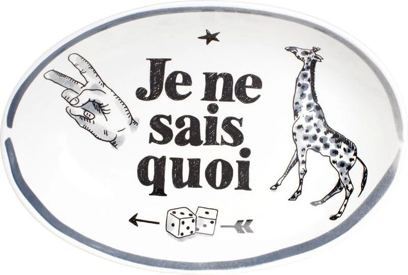 Van het bekende Blondservies is er nu ook de zwart-witte tegenhanger BLOND X NOIR. Net zo herkenbaar handcrafted, maar met een ingetogener uitstraling. Deze ovalen schaal is voorzien van de tekst ‘Je ne sais quoi’ en illustraties van een giraffe, dobbelstenen en een hand. Nu dus ook Blond Amsterdam voor wie minder van het bonte en blozende is. De schaal is gemaakt van aardewerk en heeft de kleuren wit en zwart. De schaal mag in de magnetron en vaatwasser.