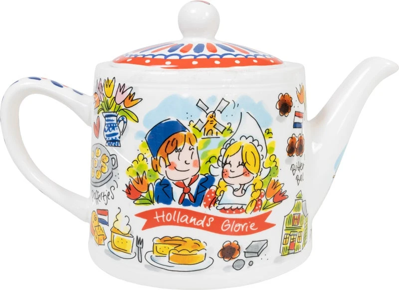We love Holland! De nieuwe Hollands Glorie lijn van Blond Amsterdam is vormgegeven in frisse rood/wit/blauwe tinten en voorzien van typisch Hollandse illustraties. In deze collectie kan een theepot niet ontbreken. Op deze ovaal vormige theepot staan o.a. een meisje op de fiets, stroopwafel en klompen. Op de deksel staan vrolijke strepen en op het handvat rode hartjes.