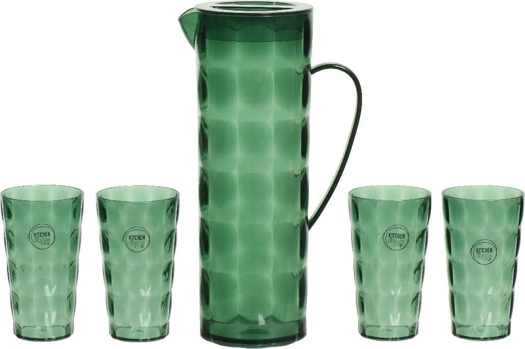 Serveer de lekkerste drankjes met deze leuke Enzo kan met bekers in gefacetteerd blokkenpatroon. Kan Enzo met bekers is gemaakt van kunststof in een mooie diepgroene kleur. Ideaal dus met kids en bij gebruik in de tuin of op de camping! Det set is 5-delig en bestaat uit een kan met 4 fijne bekers. Wat zullen we drinken? Kan Enzo met bekers is ook beschikbaar in de kleur terra bruin.