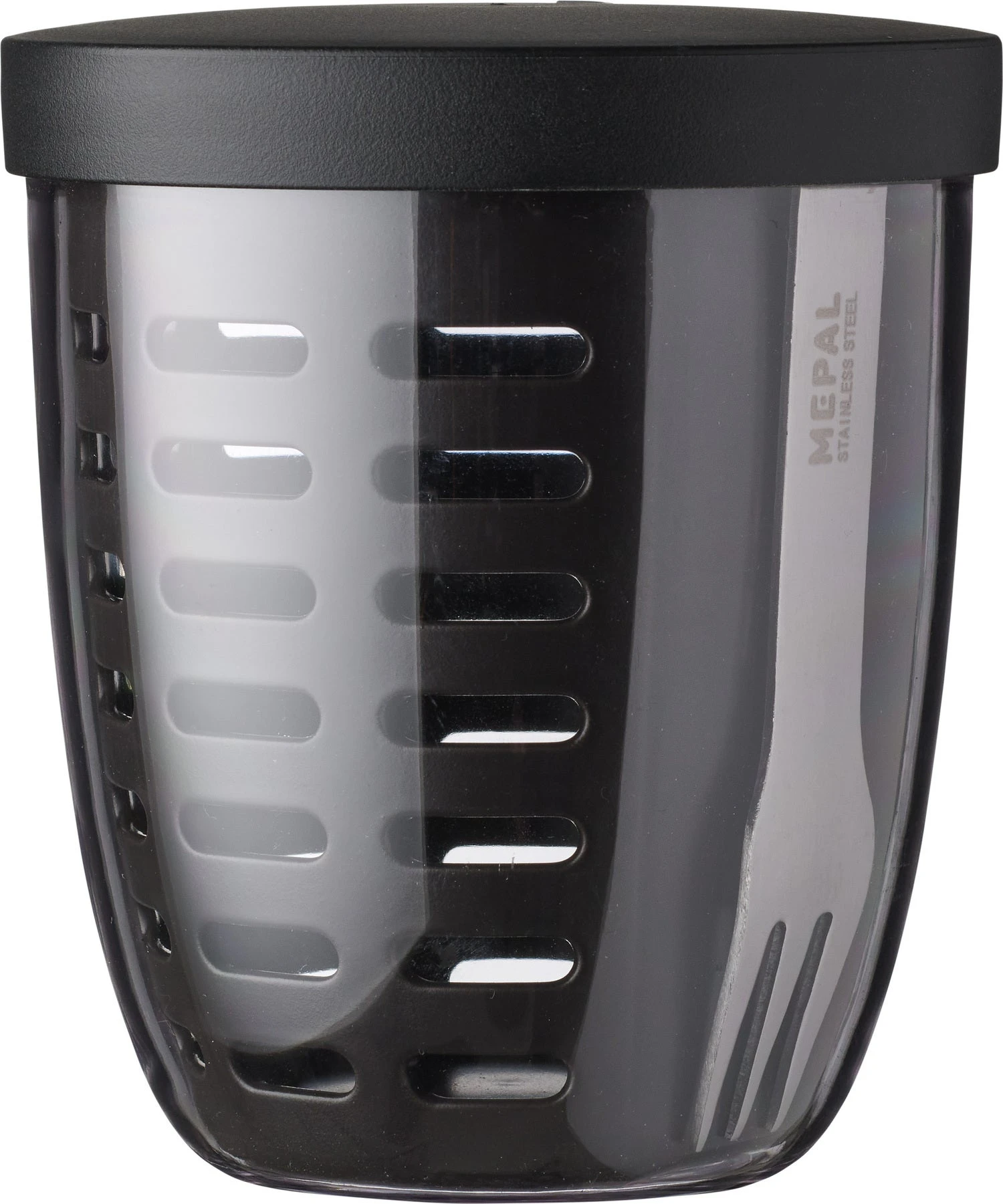 Snack gezond en neem je fruit en groente eenvoudig mee in de fruit- en veggiepot. Voorzien van slim vergietje, zodat jouw lekkers ter plekke afgespoeld kan worden. Een stijlvol RVS vorkje wordt ook meegeleverd!