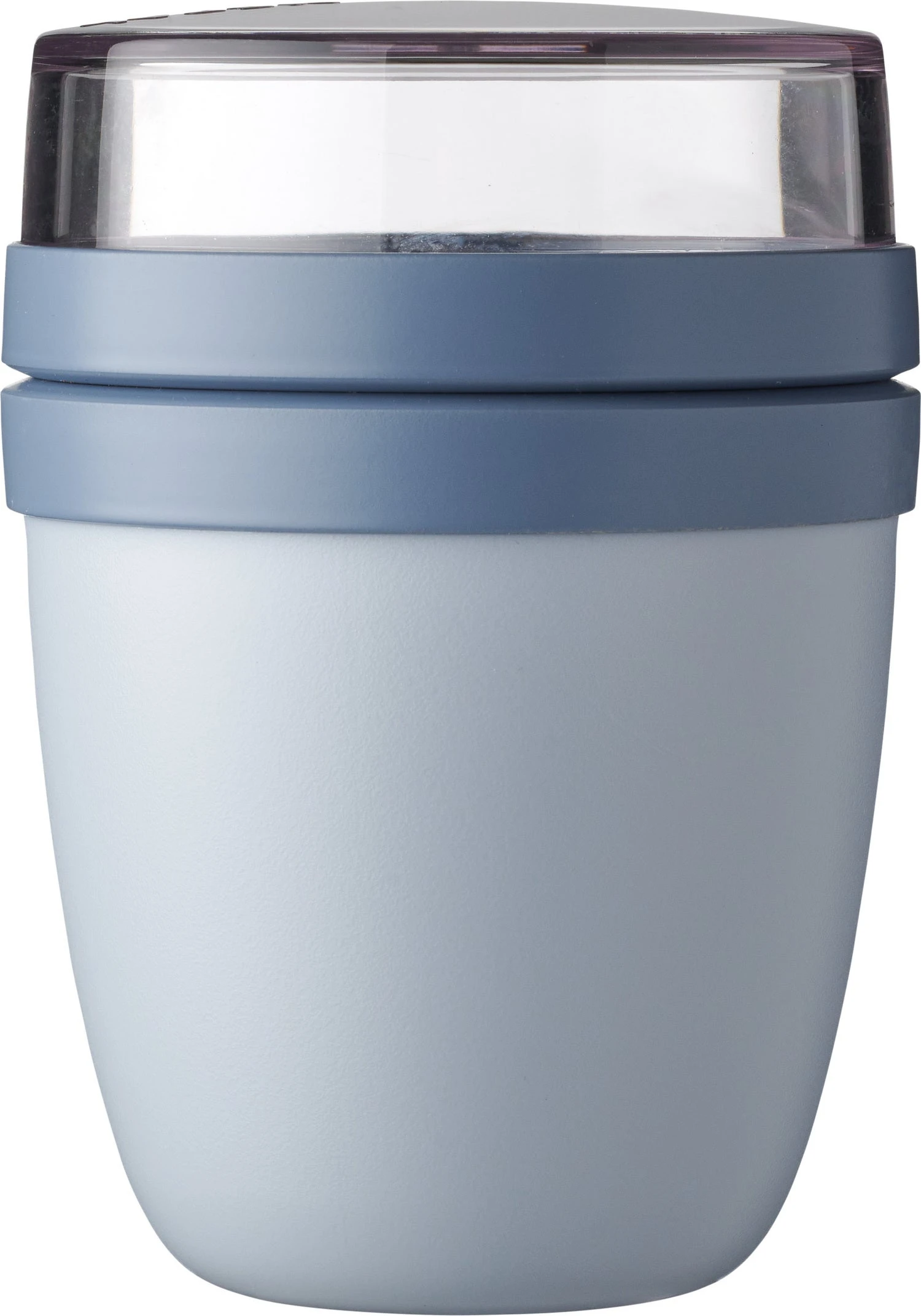 Lunchpot Ellipse mini, het kleine broertje van onze bekende yoghurtbeker. Dankzij zijn twee verschillende (lekvrije!) compartimenten neem je alle ingrediënten voor jouw lunch of tussendoortje makkelijk gescheiden mee. Nog even mixen en genieten maar!