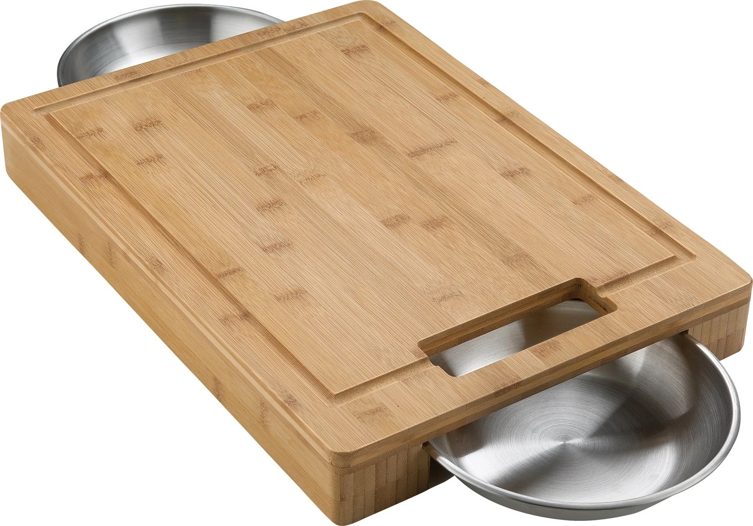 Hoogwaardige bamboe snijplank met 2 RVS kommen voor het opvangen van vleessappen en gesneden groente 33 cm x 46 cm x 5,5 cm.
