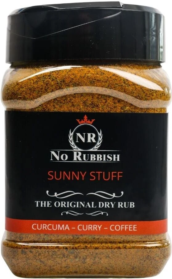 Een vette knipoog naar die intens warme smaken van Zuid Amerika. De zonnige kleur staat symbool voor de levendigheid en passie in deze rub. Ultiem genot met een kick van de Madame. De kernsmaken van deze rub zijn Kurkuma, gerookte kerrie en koffie. Ook wanneer je niet barbecuet, zijn deze kruiden lekker om te gebruiken bij een stukje vlees uit de pan. De No Rubbish Sunny Stuff rub heeft een inhoud van 200 gram.