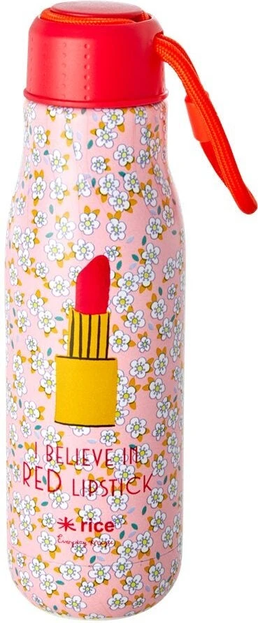 Rice heeft vrolijk gekleurde drinkflessen van roestvrijstaal en is daardoor geschikt voor koude en warme dranken. Ideaal voor onderweg, het houdt je drankje 24 uur koel of 12 uur warm. Deze drinkfles heeft een afgebeelde lipstick en je kunt er 0,5 L aan vloeistof in bewaren. De handige draaidop voorkomt dat de fles gaat lekken.