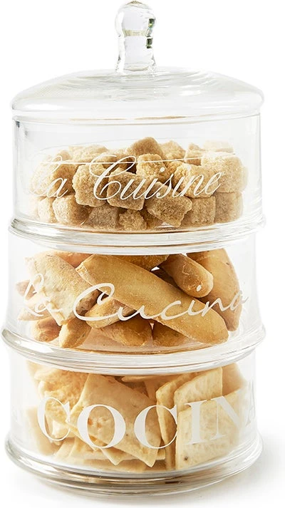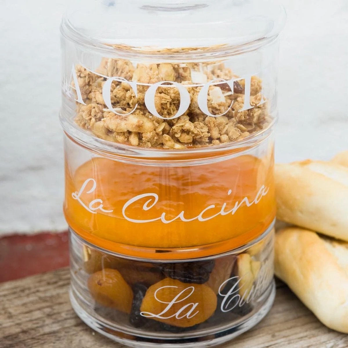 Deze mooie voorraadpot is met recht een van de bestsellers van Rivièra Maison. De pot heeft drie verschillende compartimenten waarin u van alles kunt bewaren; zoetigheden, koekjes, suiker of bijvoorbeeld muesli. Op de drie delen van de pot staat in verschillende stijlen in het Frans, Italiaans en Spaans ‘de keuken’ geschreven.