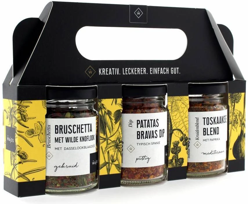 | Ingrediënten | Patatas bravas: 31,4% chili, 23,3% tomatenvlokken (tomatenconcentraat, maïszetmeel), knoflook, suiker, zout, peper, curry (MOSTERD), olijfolie. Wilde knoflook bruschetta: 36,4% tomatenvlokken (30,9% tomatenconcentraat, maïszetmeel), 28,9% paprika, kruiden (SOJA), bieslook, rozemarijn, peterselie, zout, knoflook, basilicum, oregano, maltodextrine, jalapenopeper, 1,1% uien, olijfolie, zonnebloemolie, 0,1% gerookt zout. Toskaanse blend: Zout, paprika, uien, selderij, knoflook, suikers, wortel, tomatenpoeder, peterselie, olijfolie, chili, oregano, tijm, rozemarijn, natuurlijke smaakstoffen, peper |