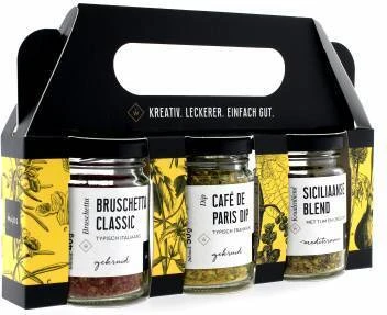 | Ingrediënten | Paris dip: 22,6% knoflook, uien, MELKSUIKER, SELDERIJ, zout, 4,8% peterselie, 4,2% dragon, 4,2% kurkuma, natuurlijke smaakstoffen, peper, kruiden, salie, 1,4% tijm, 1,4% oregano, zuur: citroenzuur, koriander, SOJAOLIE, chili, paprika, 1% rozemarijn, kruiden SOJA, weiproduct (MELK), dextrose, zonnebloemolie. Siciliaanse blend: Zout, oregano, tijm, uien, tomaten, paprika, knoflook, olijfolie, kurkuma. Bruschetta classic: 69% tomatenvlokken (tomatenconcentraat, maïszetmeel), 7,5% knoflook, zout, paprika, oregano, 4% basilicum, uien, olijfolie |